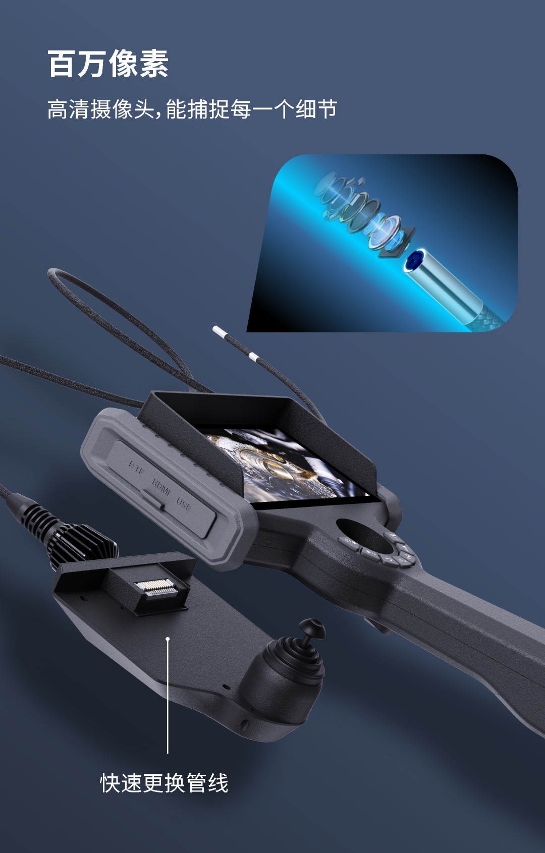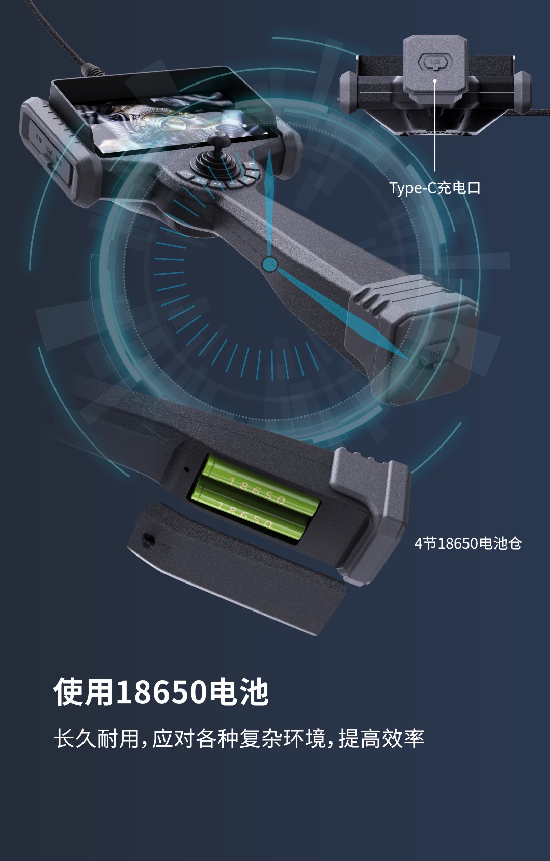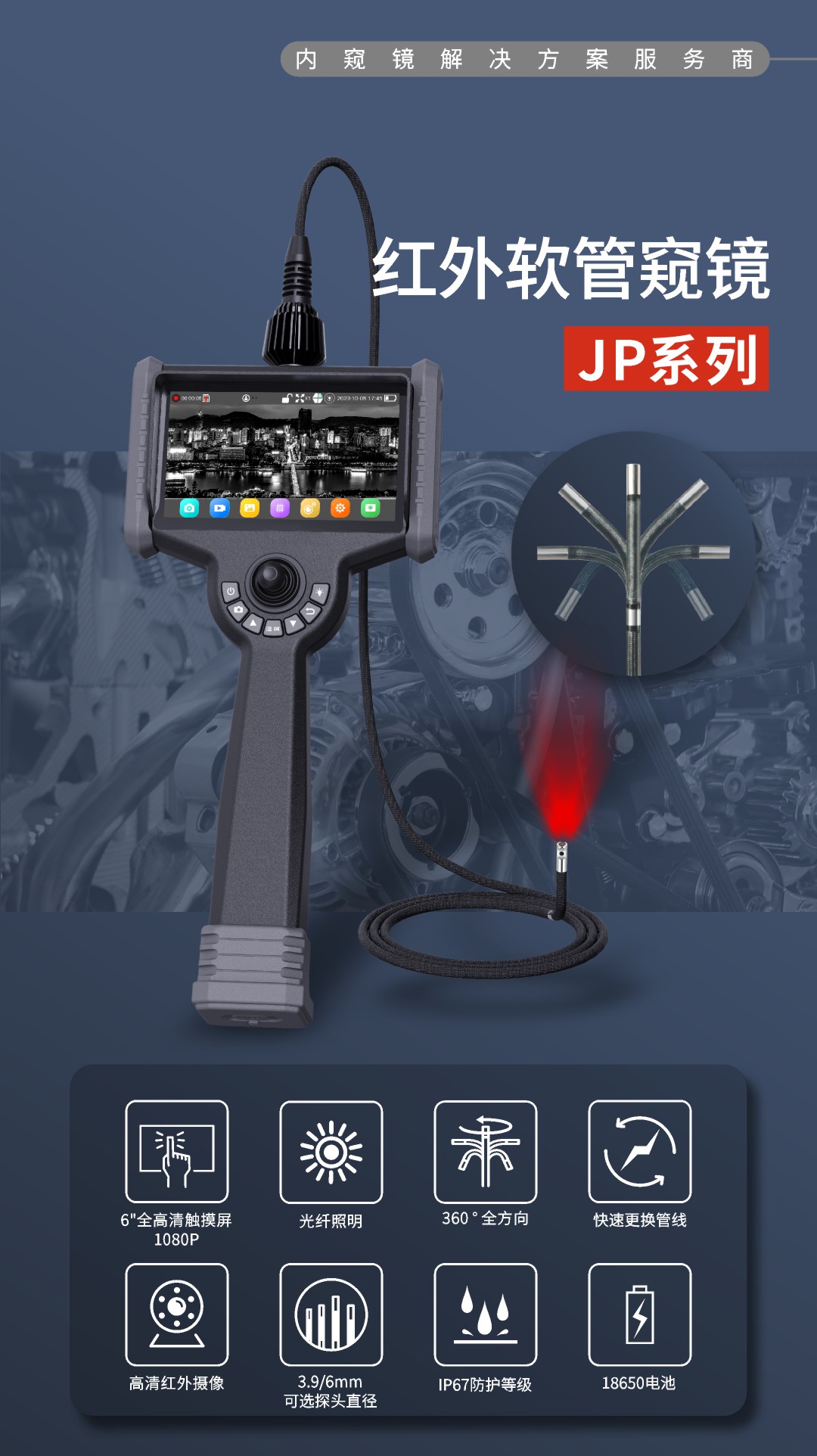 優(yōu)勢特點:紅白雙光源;6英寸大屏;雙電路設(shè)計,單節(jié)電池也能工作;360°旋轉(zhuǎn)探頭