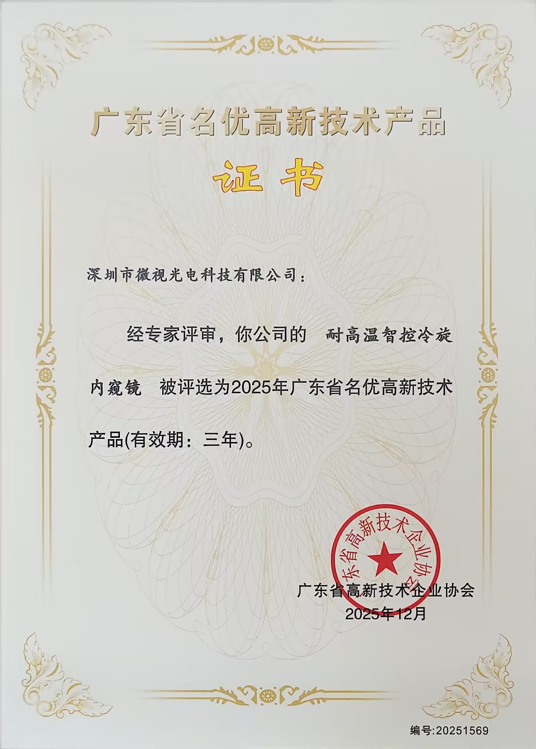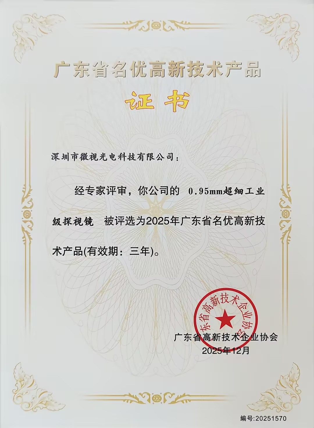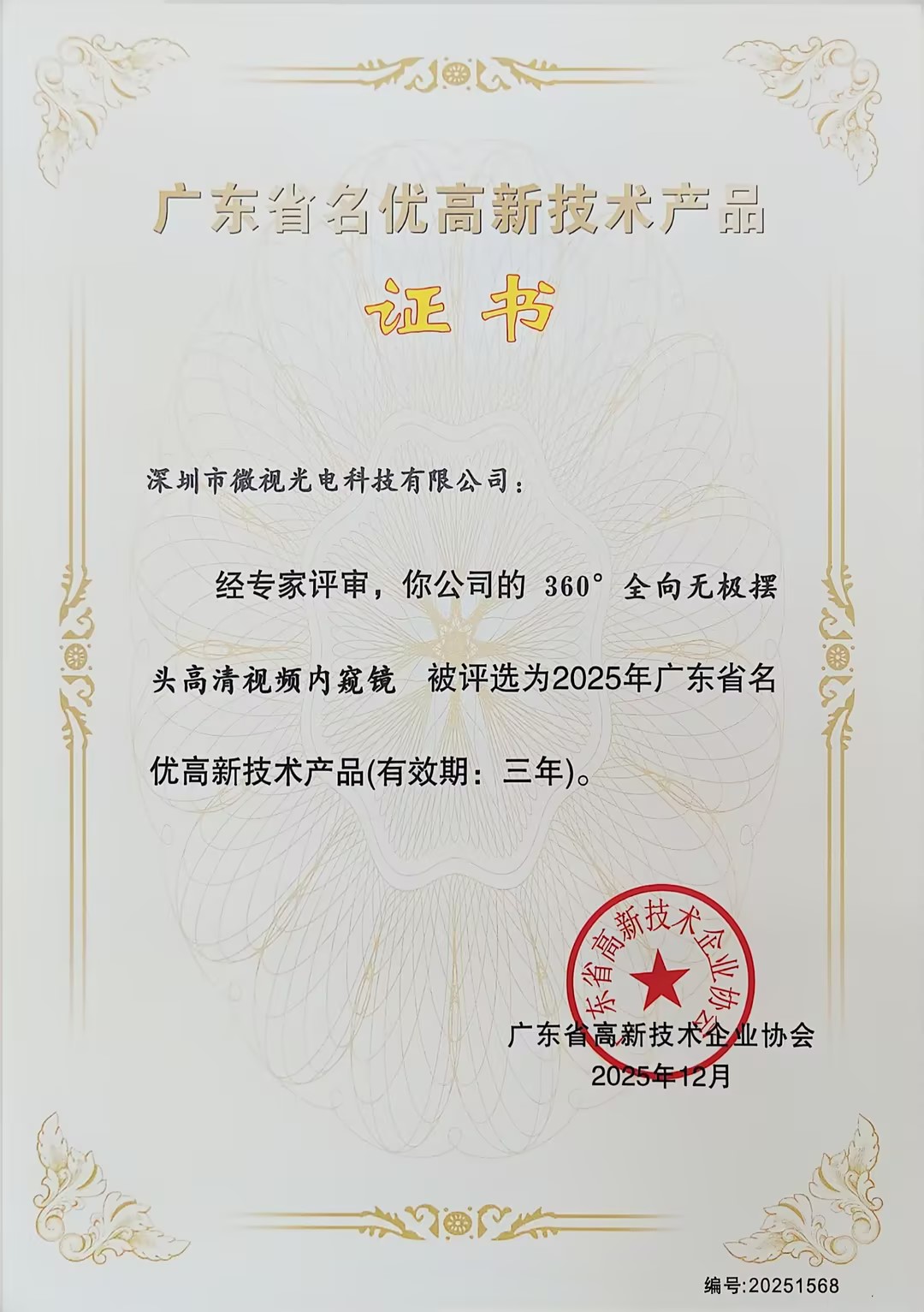 近日,深圳微視三款創(chuàng)新產(chǎn)品:耐高溫智控冷旋內(nèi)窺鏡、0.95mm超細工業(yè)級探視鏡以及360°全向無極擺頭高清視頻內(nèi)窺鏡,均榮獲“2025年廣東省名優(yōu)高新技術產(chǎn)品”稱號。這一認證不僅是對微視光電技術實力的高度認可,也標志著公司在高新技術領域的又一重大突破。