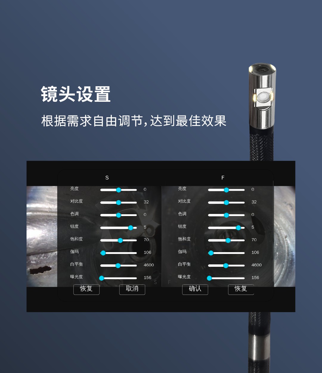 優(yōu)勢特點:紅白雙光源;6英寸大屏;雙電路設(shè)計,單節(jié)電池也能工作;360°旋轉(zhuǎn)探頭